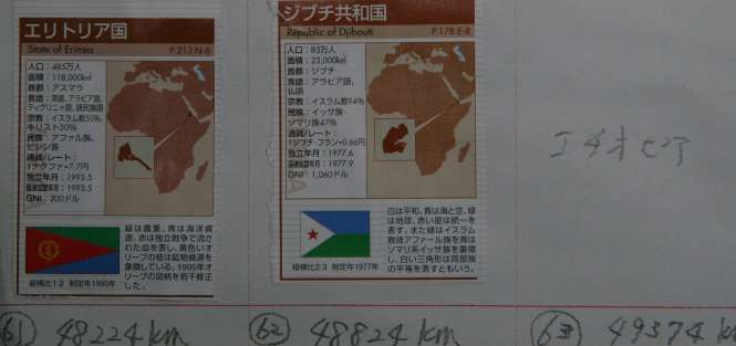 10月31日付け更新 チーム合計2372km 世界一周総合ー49896km 個人距離ー出海ー469km、米沢直ー434km、村西ー335km、中村ー342km、堂谷ー288km、北川ー267km、新保ー108km、長田ー81km、谷ー48km はいっ!一人消えたぁぁっ〜。ほっといて先進みます。 先月アフリカ大陸スーダン(ハルツーム)47524km〜エトリア(アスラマ)48224km〜ジブチ(ジブチ)48824km〜エチオピア(アジス・アベバ)49374km〜ソマリア(モガディシュ)へ向かう途中です。 61エトリア〜62ジブチ〜63エチオピア |