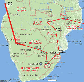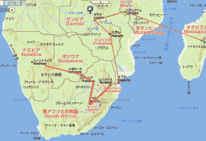 更新(3/12)チームの総合ー1962km 世界一周総合ー58946km、 スワンジランド(ムババネ)56984km〜レソト(マセル)57484km〜南アフリカ共和国(プレトリア)57884km〜ボツワナ(ハボローネ)58184km〜ナミビアへ向かう途中です。 79レソト〜80南アフリカ共和国〜81ボツワナ〜ナミビア |