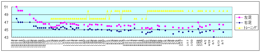 1 2 3 4 5 37.16 39.04 38.28 37.91 38.46 38.27 38.65 38.07 38.20 37.93 39.03 38.44 39.00 38.02 37.77 38.87 39.18 39.07 38.31 37.89 39.00 37.45 39.65 37.20 36.94 3'12.33 3'12.76 3'14.07 3'09.64 3'08.99ふくらはぎの筋肉痛は、走った直後からひどく、練習後はびっこを引くほどになった。ちょっと無理しすぎたかな。