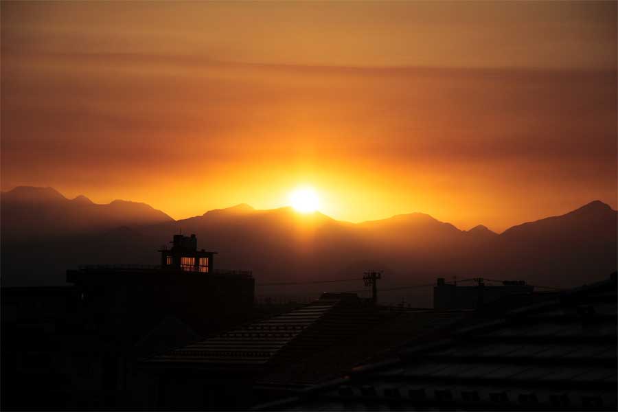 氷見のあたりから、山の端(立山)がオレンジに染まってきた。羽咋のあたりから黄色(能登の山)になり、少しずつ色が変わって来た。きれいだった。気温は1℃ -1℃ 0℃と氷点下のところも会った。志賀は周りが霜で白かった。