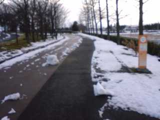 走ると、道の両側は雪。車道しか走れない。こういうときは早朝の車の少ないときがいい。車道を走ってもほとんど影響がない。妙に遠慮して、端っこを走ると凍っていて、つるっときそう。しばらく走りに都合の悪いシーズンになった。車道は普通に走れるので、走りも普通。あまり疲れは感じない。が体は動かない。