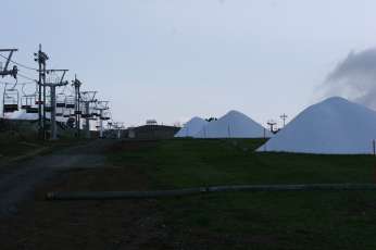 白い砂のような山が沢山。雪?。近くまで行ったらやはり雪。今から人口雪を作ってopenの時には均して使うのだろう。奥のゲレンデにはもうリフトがない。ロープウェイも外されていた。