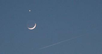 夕方、買い物に行こうとしたら、月と☆。これはと写真を撮ったら流れ星が写っていた。前後の連射写真から判断すると、飛行機にしては速過ぎる。