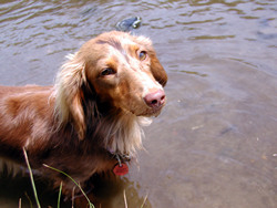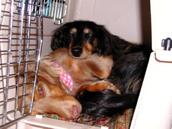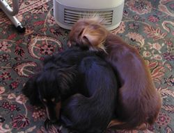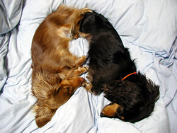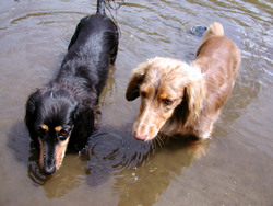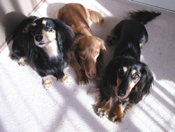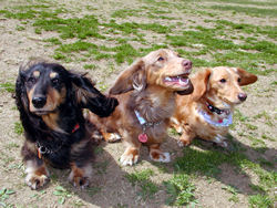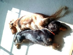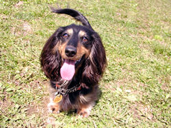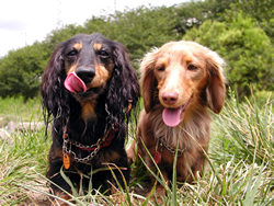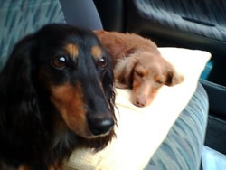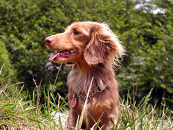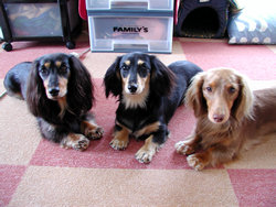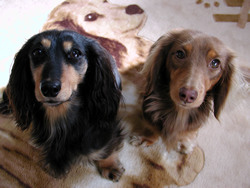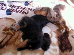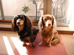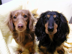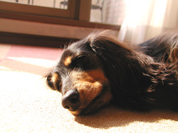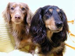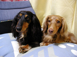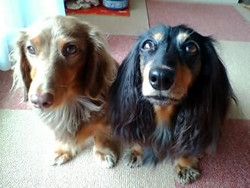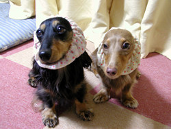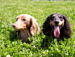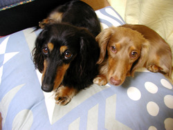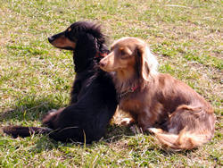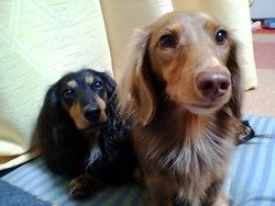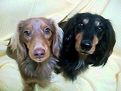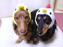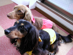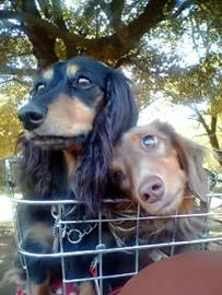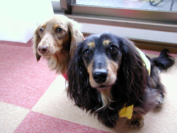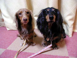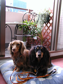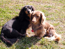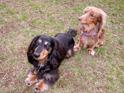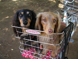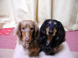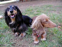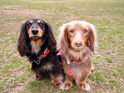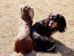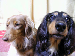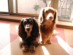 | 【夏も終わりかな・・・】byチホ 連続真夏日も終わってしまい、だいぶ涼しくなりました。夏が終わってしまうとちょっぴりさびしくなります・・・。モモもビワも毎日とても元気で、散歩して食べて寝てといううらやましい生活をしています。モモはますます言葉の分るいい子になっています(親ばかですが・・・) モモは打てば響く感じがして、なんか会話をしている感じになるので、本当にかわいいです。ビワはますます動かない、まったりした女になってます。打っても響かない女だけど、見た目はぬいぐるみみたいでかわいいです。同じダックスなのにまったく違う性格っていうのも面白いです。希望としてはビワも少し動いてほしいけど、他にいいところもあるしね(^-^) |