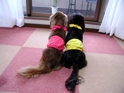| 【U^_^U】byビワ 最近お散歩に連れて行かれないときもあります。びーたんはお散歩がなくても全然大丈夫よ。モモ姉ちゃんがこの前「めがまわる」と言っていたので、ちょっと支えてあげました。ちょっと楽になったみたいでした。金曜日はモモ姉ちゃんがずっといなくて、寂しかったけど、夜病院でモモ姉ちゃんに会えてうれしかったです。思わず「クーン!」って声が出ちゃいました。チホ姉ちゃんも「ゴホゴホ」と苦しそうなので、ビワがチホねえちゃんも支えてあげます。でもお留守番のときに、トイレシートバリバリしちゃいました。もちろんチホ姉ちゃんに怒られました。 |