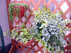 | 【台風一過で…】byチホ 晴れると思ったけど、晴れませんでした…。一日曇り…。そして寒い…。昨日、勝手口(?)近辺に置いてあった植物達がすべて台風で倒れてしまいました…。ものすごく風が吹いていたのと、隣にアパートがあるので、ちょうど風の通り道になってしまうところに配置してしまったので…。台風を甘く見ていました…。風の通り道でないベランダに置き換えてミニガーデンに作り変えてみました。ほとんど引越しのときに頂いたお祝いの植物なんですけど、かわいくまとまりました(^-^) カフェ風です。まだ外で食事をしたことはありませんが…(^^;) リフォーム後にモビの記念撮影!明日はびーたんの誕生日です。ビワも2才になりますが、まだ子供みたいです。さっぱりした性格で、トロイもんな〜〜。 |