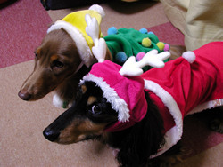 | 【いい天気でした〜】byチホ 今日は3時間も散歩に行ってしまいました!天気が良く、暖かかったので、ついつい長居をしてしまいました。マザーグースでビワのクリスマス衣装を買ってきました。ツリー柄〜〜♪モモは去年購入したサンタさんに、トナカイさんのスヌードをプラスしてみました。きゃーかわいい〜〜(*^。^*) でもモモもビワも服を着慣れないので、すっかり固まってしまってました。せっかく購入したので、クリスマス仮装パーテーでもしないとね〜〜(^-^) |