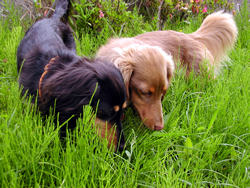 | 【モモ〜】byチホ モモはいい奴です。親ばかですが、7歳になって今までと違うモモを見たような気がして、最近前よりずっとそう思います。今日は公園でお友達のワンちゃんの妹にあたるウサギのラムちゃんに会いましたが、最近まで家に少しだけいたジジちゃんにしたように、ベロベロして、前歯で軽くガジガジしてました。例のごとくウサギちゃんはモモのヨダレだらけだったのですが、されるがままになってました。もちろんビワも興味深々!!モモもビワもはミンチになっているウサギの肉も食べているので、私は食べちゃうかと思って、ドキドキしていたのですが、モモはモモなりにとっても優しくしていました。ビワの時はそう思わなかったのですが、母性本能があり、人間の赤ちゃんも大好きだし、赤ちゃんならウサギちゃんもネコちゃんも大好きなようです。今までやってきたことからすると、モモは強暴だとずっと思っていました。誤解しててゴメンね。モモ!最高にかわいいよ〜〜(*^。^*) モモは私の言葉をとっても理解できている気がしますので、いつも会話してるような感じです(^-^) いつまでも赤ちゃんみたいなビワももちろんかわいいよ〜〜(*^。^*) ビワとはうまく会話できないけど…(^^;) そうそう、モモは自分のおしっこやうん●をトイレシートにした後、隠すようにトイレシートを丸めます。ネコのジジちゃんがいたときは、ネコ砂トイレの中のジジちゃんのおしっこを、鼻を使って必死に隠してました。ジジちゃんのママさんになったつもりだったのかな〜?なんだかビワには厳しいような気がするけど、優しいモモが大好きだよ〜!! |