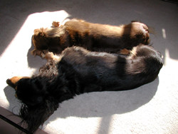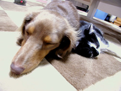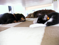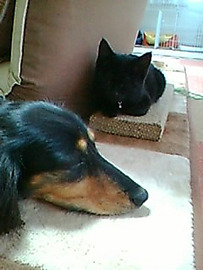 | 【U゚〜゚U】byモモ 最近、雨だったりして、お散歩も行ったり行かなかったり。晴れている日は公園でチホとボールで遊んでやってる。家ではビワと日向で寝ているけど、モモ様は黒いのですぐに暑くなって、日陰に退散する。ビワはず〜〜〜〜っと日向で寝ているし、少しずつ日向の位置が変わると、移動して意地でも日向に寝ている。まったく変な奴だ。 |