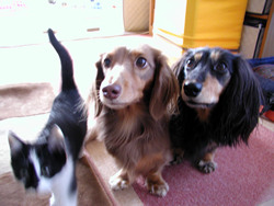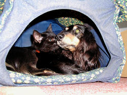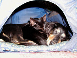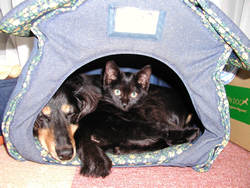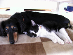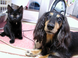 | 【ジジちゃん幸せに】byチホ 今日、ジジちゃん(仮名)の新しいお家が決まりました(^-^) 明日とっても優しそうなご夫婦に引き取られます。ネコちゃん1匹と、ダックス2匹の暖かい大家族に囲まれて過ごします(^-^) ネコちゃんとワンちゃんとも仲良くなって、絶対に幸せになってね(^-^) 今日はうちにいますが、明日さよならです。最初は恐がっていたけど、人にもワンコにもだんだん慣れて、今日はビワも交えて大運動会してました。ジジちゃんは、寂しがりやみたいで、モモのすぐ近くで寝ています。たぶん、お外にいたときに、淋しかったのね…。お留守番も夜もお利巧に、モモの小さなバリケンで、ネンネしてくれてました。とってもいい子だと思います〜。爪も壁では1度も研ぎませんでした。ちっちだけ失敗したけどね〜(^-^) おかげで今まで1度も洗ったことのない布団も洗って、とってもきれいになりました〜♪ ご飯もおやつもワンコに負けないように一生懸命食べて、1度も残したりしませんでした。テーブルにも上ろうとして、モモに何度も邪魔されてからはテーブルに上がりませんでした。モモは常に見張っていて、なぜかジジちゃんを前歯でガジガジしていました。ジジちゃん小さいのでいじめないでよぉ〜って感じでしたが、もしかしたら愛情表現なのかもしれませんね。でも、あまりしつこくするので、モモはジジちゃんがいる間、怒られることが多かったです。ビワはネコパンチで、萎縮してしまい、ちょっとかわいそうでしたが、今日は少しなじめた感じですが、ジジちゃんの下っ端のようです。ジジちゃんこの5日間、本当にありがとうね〜。 |