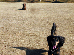 | 【近くの公園】byチホ 今日は競馬場の公園に遊びに行きました。ビワがボールを持って走る姿を、めずらしく撮影できました。盛り上がって走ってましたが、飽きるのもお早いこと…。左の写真は「待て」をさせて「おいで」と言ったんですが、モモ様だけが走ってきまして、ビワは「私はうごくのはきらいです」みたいな感じで遠くで豆粒のように写ってました。10月でモモ様は7歳になったけど、ボールをするととても楽しそうで元気です。モモの体も考えて明日は歩くだけにしよ〜。ビワもそのほうが痩せていいかも…(^^;) 今日はモモ様とビワをシャンプーしてキレイにしました〜!!静電気でホコリがすごかったみたいで、茶色い水が出てきました(^^;) 振り返れば、今年はいろいろとドジをしたり、ネコを拾ってきたりで、大変な1年でした。みなさんに励ましていただいて、なんとか乗り切ることが出来ました。来年は穏やかなよい年にしようと思います。みなさん!よいお年を!! |