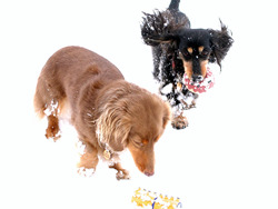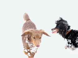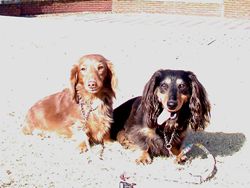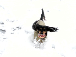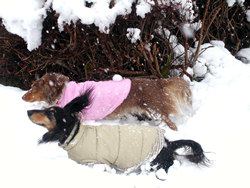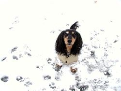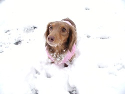 | 【U@⌒▽⌒@U】byモモ 今日は2度も散歩に連れて行かれた!!!ラッキー!!1度目の散歩はボールで遊んだ。ボールを投げてもらうと雪の中に埋もれてしまい、なかなか見つからないのが大変だった。でも2度目はチホがモモ様のボールを持ってくるのを忘れたので、「役立たず!」と恨んだ。ブーイングだよ。 |
