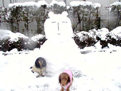 | 【大雪!】byチホ 今日はお散歩は歩くだけのつもりだったのですが、雪が降ったので、となりにある競馬場の駐車場で遊びました。妹が雪だるまを作ったので、記念撮影をしました。モモ様はルンルンで、新雪部分をピョンピョン跳ねながら走り回ってました。「ゆ〜きやこんこん あられやこんこん…♪」とつい歌ってしまいました〜(^-^) ビワと言えば、最初は楽しんで走り回っていたのですが、そのうち動かなくなって、足が冷たくなってきたようで、片足ずつあげていました。帰りももう歩くことが嫌だったようで、モモのルンルンさとは対照的にスゴスゴ…と歩いてました。家に帰るとモモ様もビワも足に雪だるまができてしまって、足がたいへんなことになってました。 |