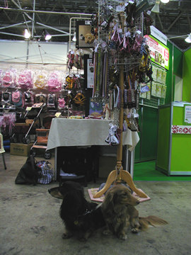| 【東京ペットショー】byチホ 3/28〜4/2まで東京ペットショーに出店してきました。かわいいワンちゃんたちを連れて、たくさんの方が遊びに来てました。CHIMOMOを使ってくださっているお客様にたくさん出会えて、とてもうれしかったです(*^。^*) 普段はネットショップなので、お客様にご挨拶が出来る機会があって、本当によかったです。モモとビワのお里であるメルヘンさんに感謝!大型犬のお客様がとっても多く、見ていただいた方々に「かわいい〜〜」といっていただいたのが、本当にうれしい限りでした。皆さんしつけをされている方がとっても多く、ハーフチェーンを好んでお使いになっていらっしゃいました。モモとビワも一緒に出勤してました。モモもビワもお利巧さん(親ばかだけど…)なので、手もかからなく、お客様が少なくなってからはハウスから出して看板犬としても活躍してくれてました。目の前のブースがフード屋さんだったんですが、フードをたくさんもらって、モモもビワもスタッフの方にとっても懐いてました。モモも私がいなくても全然大丈夫になってました…。がーん。最終日の撤収の時に、台風のような大雨が…。車まで荷物を運ぶのに3往復くらいしたのですが、滝に打たれたようにびしょびしょになりました。少し時間を置いて、最後の荷物を運んだときには、雨も上がってました。もしかして行いが悪いから??? |