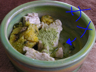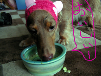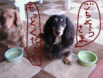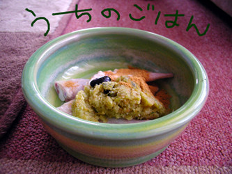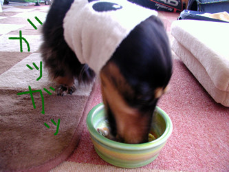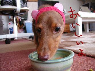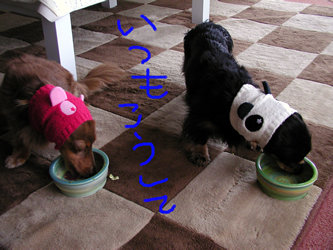 | 今日は暑かったですねぇ〜。我が家の食事のスタイルです。モモ様は耳毛がものすごく立派なので、スヌードがないと手作りご飯は食べられません。パンダさんです。取るときは耳をつまめるので、便利です。 | ||||||