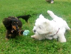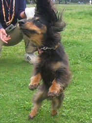 | 【ボールやフリスビーについて】byチホ いつから日記書いてなかったんだぁ〜?と驚いてしまいました・・・。 今日はまじめに「持来」についてのお話を少々します。まず言葉をたくさん覚えさせることから始まります。私は「犬と遊ぶ」ということをしたかったので、「オイデ」「持ってきて」「キャッチ」「ポイ(ダセ)」という言葉を、来てすぐから言っていました。偶然でもこっちに寄って来たら、「オイデ」といい、偶然におもちゃなどを持ってきたら「持ってきて」と声をかけます。うちの場合、子供のころは、フードを使ってご褒美をあげたりしていましたが、遊ぶ楽しさを覚えればフードは必要なくなります。「ポイ」も無理やり口から出すこともしましたが、小さいおやつと交換をして、言葉を覚えさせました。子供の頃はいろいろなことを1日で覚えたりします。外に出れるようになったら、外でも同じことを少しずつします。そのうちボールを少し高く投げて「キャッチ」という言葉を覚えさせれば、フリスビーの下準備はだいたい出来ます。ダックスでやっている方はまだまだ少ないので、是非皆さんもフリスビーを始めてください〜。 モモも子供の頃は、家でおもちゃで遊んでも、外で遊ばなかったりしました。でも、あきらめずに毎日毎日ボールを持って行き続けて、ある日やっとボールで遊んでくれました。うれしかったです(^-^) 「オイデ」は6ヶ月くらいまで完璧でしたが、今となっては・・・(^^;) でも、「持来」のことばかり集中してやっていたので、「マテ」は最近になってやっと出来るようになりました。今では私の姿が見えなくても、待っていられるようになりました。 しか〜し、「しつけ」では、「マテ」が一番大切なので、私のようなミスをしないようにしてくださいね。できるだけいろいろな言葉を教えてあげたら、いつか犬と会話が出来るかもしれません。ちなみにうちの会話は「おしっこしたの??」と聞くと、しっぽブンブンと振ることかな??ちょっとまじめなお話でした・・・。 |