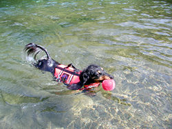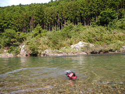 | 【あ〜】byチホ 私事の都合で、少しの間留守にしておりました。せっかく田舎まで行ったので、モモと川に遊びに行きました。散歩がてら毎日川に連れて行ったのですが、モモは少しずつ長い距離を泳げるようになりました。でも、ちょっと遠くに投げると怖いようです。最期にものすごく遠くに投げたら、途中でUターンして、取りに行きませんでした。仕方なく私が腰まで浸かり取りに行くと、流れが速く足を取られ、水没・・・。Tシャツと短パンはびしょびしょに・・・(^^;) ボールもあとわずかなところで取れませんでした。どんぶらこっこ〜。もう、海までたどり着いたかな? |