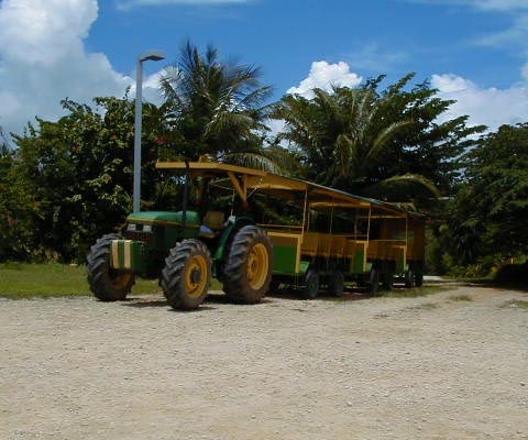 やしの皮で作ったうちわを持ち、このようなトラクターでジャングルのような農園探検!