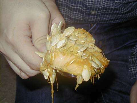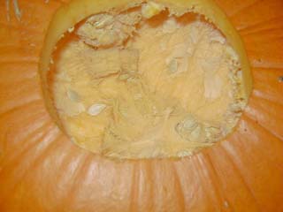 3.中身をとりだす。いっぱいつまっているようだが、大きい割に意外とがらんとあいていた。パパがやっていたが、意外と柔らかく薄くて切りやすいとのこと。 |