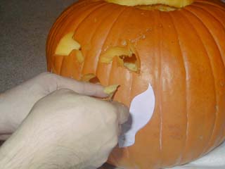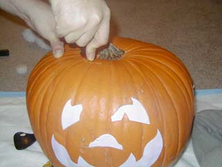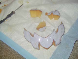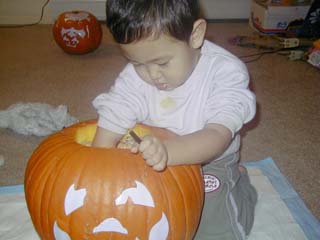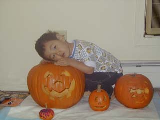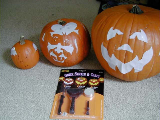 手前のものは、彫ったり切る道具。 1.シールがそのセットに入っていて買ってきたカボチャに貼って、彫るイメージを作る。 小さいのはアキが自分でマジックで顔を書きました。 |