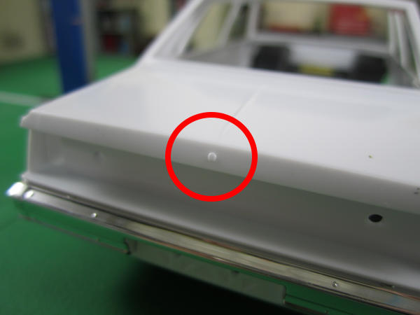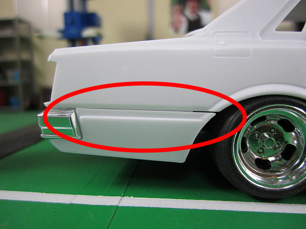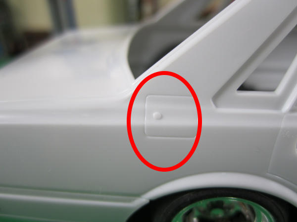実際は分割されていない部分なのでパテで一体化してあげます。 | この赤丸内もリア同様、不要な分割線が出来てしまうのでフェンダーと一体化要。