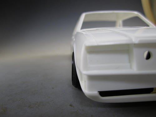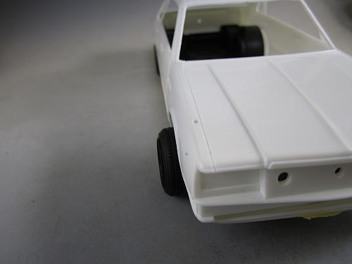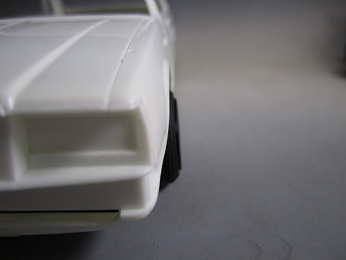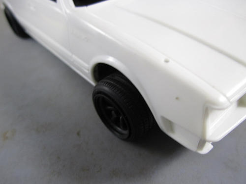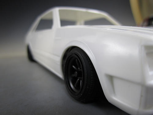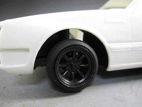 ボディとの兼ね合いを見ます。 若干キャンバーがついていつのがわかるでしょか? フェンダーからのはみ出しも無くなりました。 | フェンダーの隙間とタイヤ、ホイールの位置関係はこのような具合です。 ガレやま好みの状態です。 これにてフロントは終了です。 |