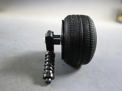 仮付けしてみるとこんな感じです。 かなり短くなりました。 | インナーフェンダー及びロアアーム(適切じゃないかな?)に刺さる 上下の突起を削除し、タミヤのソフトプラ棒2ミリを差し込んでます。 何故今回はソフトプラ棒かと言うとキャンバー角を付けるのに このプラ棒を曲げて角度を付けようと思っているからです。 |