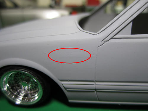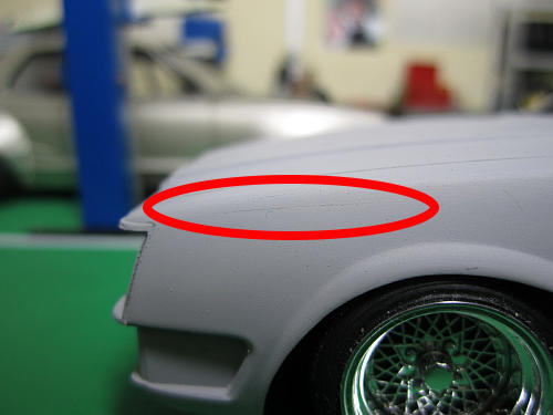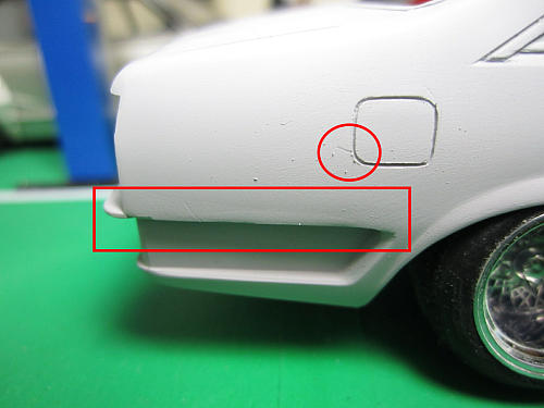 パテ後の整形の甘さが見てとれます。 | フロントアンダーの赤枠部分にパーティンぐラインが存在。