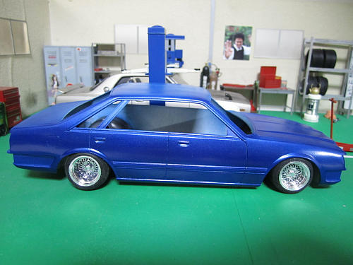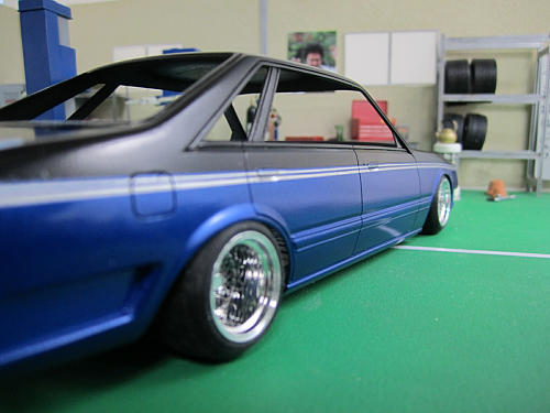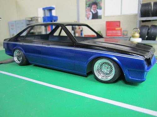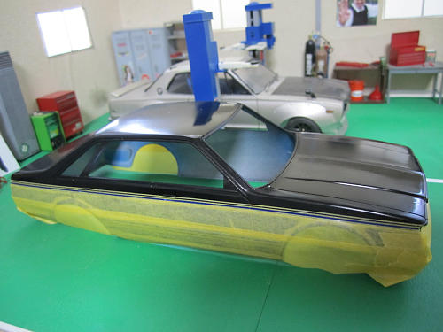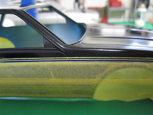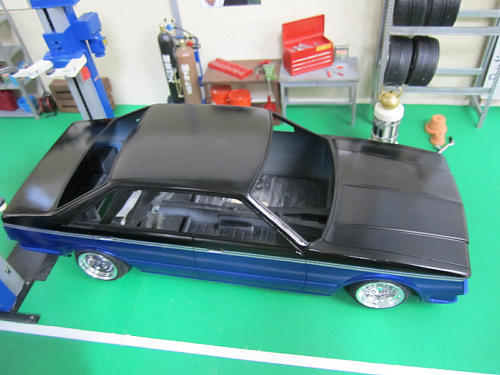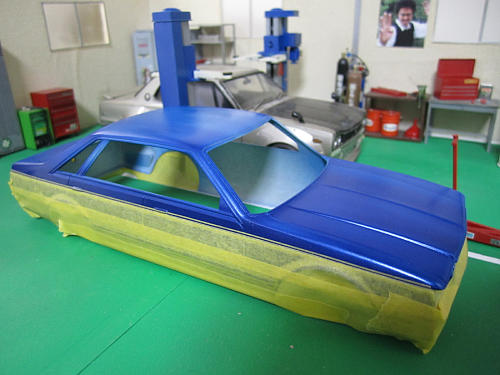 画像では明るいですが、実際は濃いメタリックブルーです。 | 今回はツートンにするのでボディ下部をマスキング。