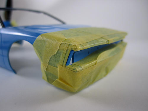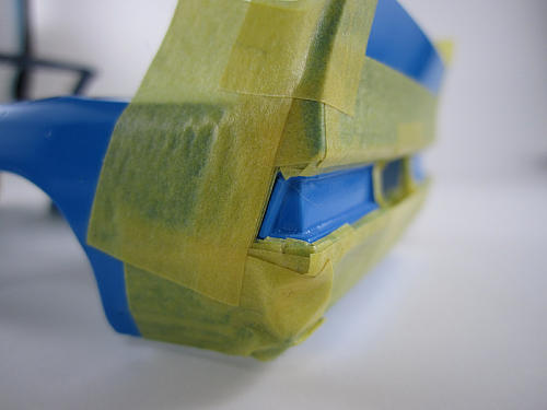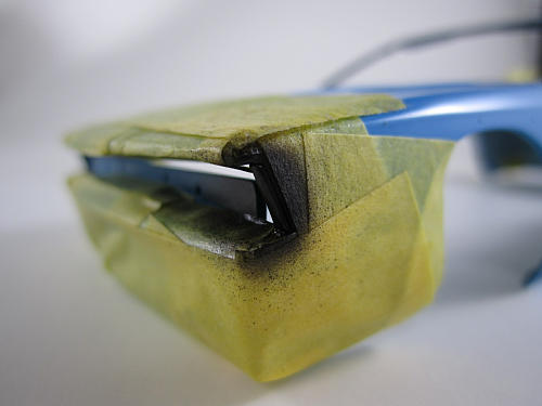 前述のサイドのモールを含めテールレンズの内側に当たる部分を フィニッシャーズのピュアブラックで塗装し、下地塗装とします。 |