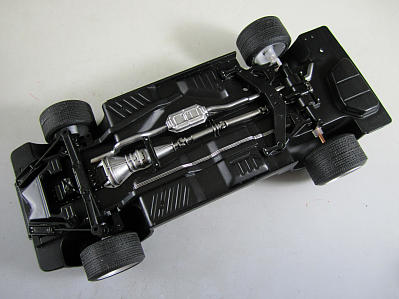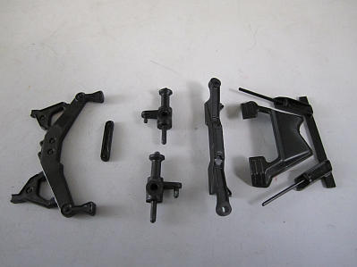 シャーシに取り付けるパーツ。 組み立てました。 すべてクレオスのセミグロスブラックで塗装。 今回、画像左のパーツに存在するボルト類をシルバーで塗装してます。 マフラーは自作するので今後紹介します。