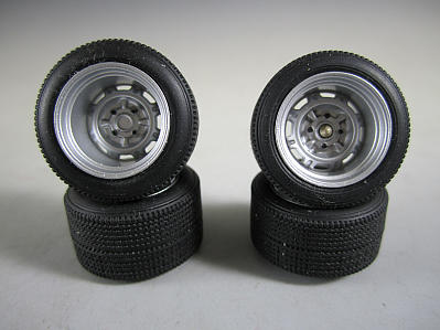 今回はシャーシを組み立ててしまおうと思い、ホイールのメッキを落としました。 右の画像からサフ吹いて塗装したホイール。 右上がキットのままの状態ですが、画像奥側に存在するタイヤ止めはタイヤから 鉄ちんはあまりキラキラしてもおかしいのでフィニッシャーズの はみ出してしまうので切り取って(手前右のように)ホイール幅を短くしています。 ファインシルバーで塗装しています。 ナットは今回ブラック。前輪(右側)の中央部はチタンゴールドで塗装しています。