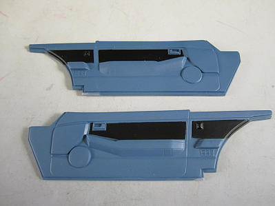 今回は内装の基本カラーを塗装しました。 左右の内張り。 青い部分はクレオスのミディアムブルーでフロアは同社ジャーマングレー。 ドアノブ等まだ未塗装です。 シートは同じくクレオスのセミグロスブラックです。