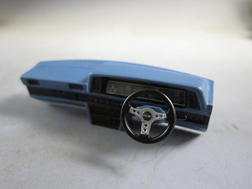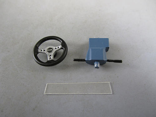こちらはハンドル等々。 ハンドルはアオシマの改パーツに入っていたハンドルを使用。 その下に写っている透明のプラ板はメータパネルに取り付けるための物 | 左のパーツを取り付けると画像のようになります。 |