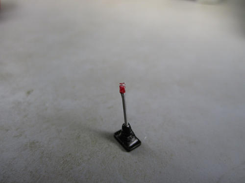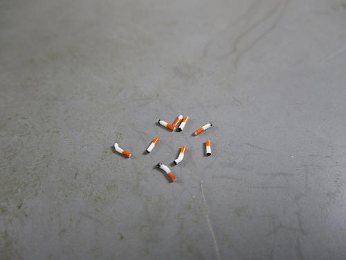 次にこちら。 0.5ミリのプラ棒にマスキングテープを巻いて塗装すると 右の画像のようになります。 | 塗装した物を切るとこんな感じ。 |