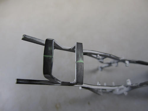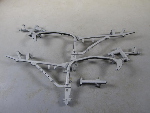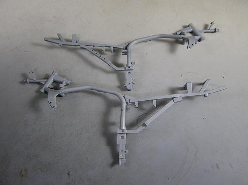 こちらは丁度タンク下に来るフレームで、車体前方のステムシャフトが入る 筒状の部分から伸びるフレームと結合されるパーツです。 このパーツはパーティングライン以外にバリも存在します。 パーティングラインを削除したフレーム。 これでフレームが組み立てられます。![]()