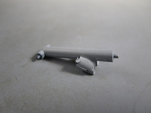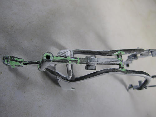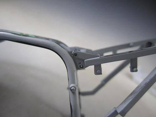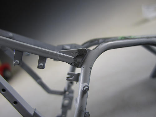フレーム組み立てた後、接合部分にパテを盛って接合部分を一体化します。 完成後は見えない部分でもありますが、自己満足の世界。 タンクより前方部分もパテを盛って成形。 ペーパをかけると結構ヒケていたことも判明します。![]()