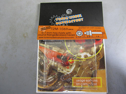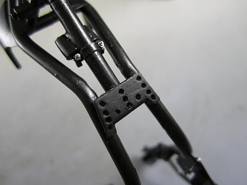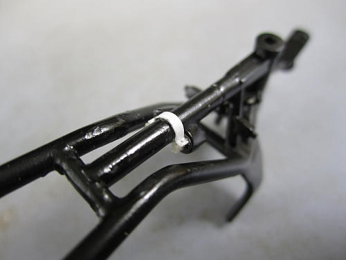 画像はフレームにモールドされている イグニッションコイルの留め金具を作っている図。 真鍮線が刺さっているプラ棒をキットのイグニッションコイルに取り付けます。 無塗装で取り付けて見るとこのような感じになります。![]()