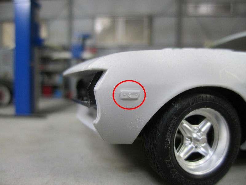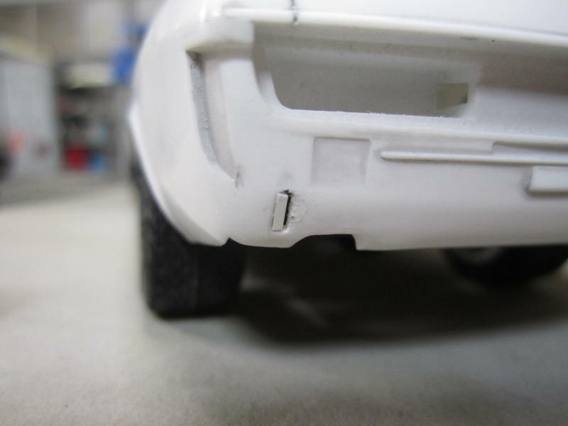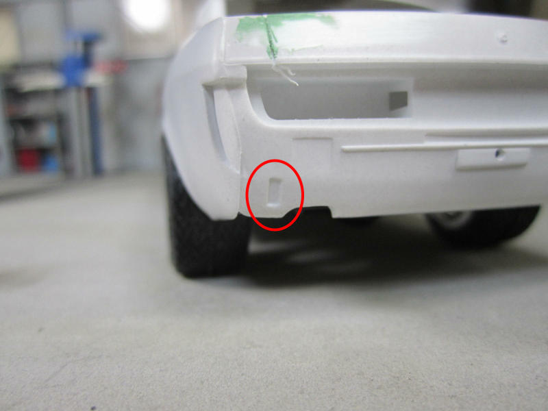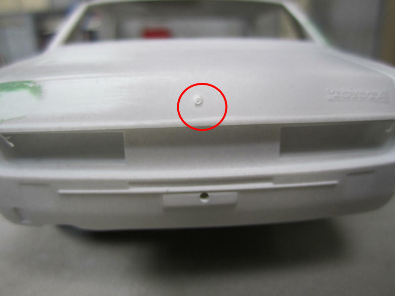 次にリアアンダーに存在する牽引フックの出口。 ボディの上からフックを接着するようになっていますが 実際はこの部分が開口されていてボディ内側から牽引フックが出てきます。 今回はここに穴を開けて実車のような感じにします。 |