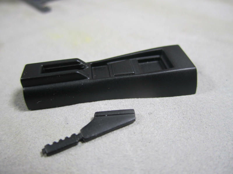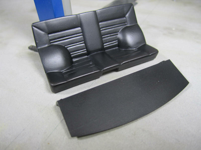 前回整形したリアシートと前出のリアトレイを塗装。 フロントシート同様セミグロスブラック一色です。 |