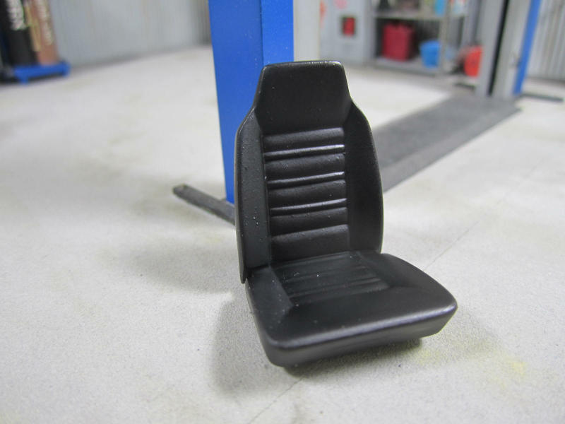 前回背もたれ裏の整形等を行っていたシートを塗装して座面に組み付けました。 よくブログで製作している模型の内装は艶を消していますが、今回はレザーっぽい材質であることから 艶は消しません。 |
