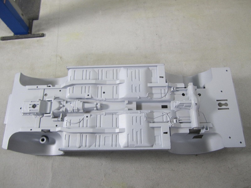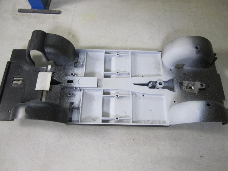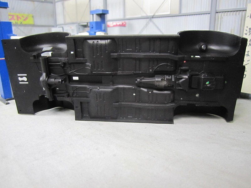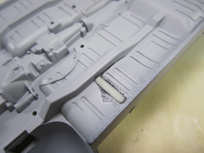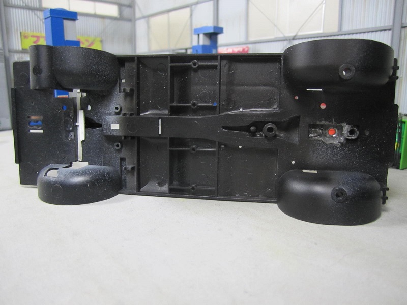 さてボディが何もできない状況なのでシャーシに移ります。 このキットは元々モーターライズなのでスイッチを取り付ける部分に穴が開いています。 その部分にプラ棒を使用して塞いであげました。 |