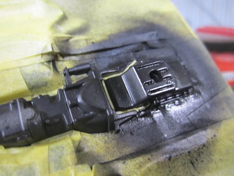 塗装しない部分にマスキングを終えたらまずオイルパン部分にピュアブラックを塗装しました。 乾燥したら再度オイルパンを縁取るようにマスキングしていきます。 |