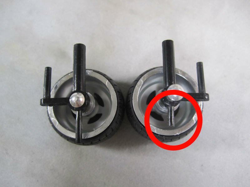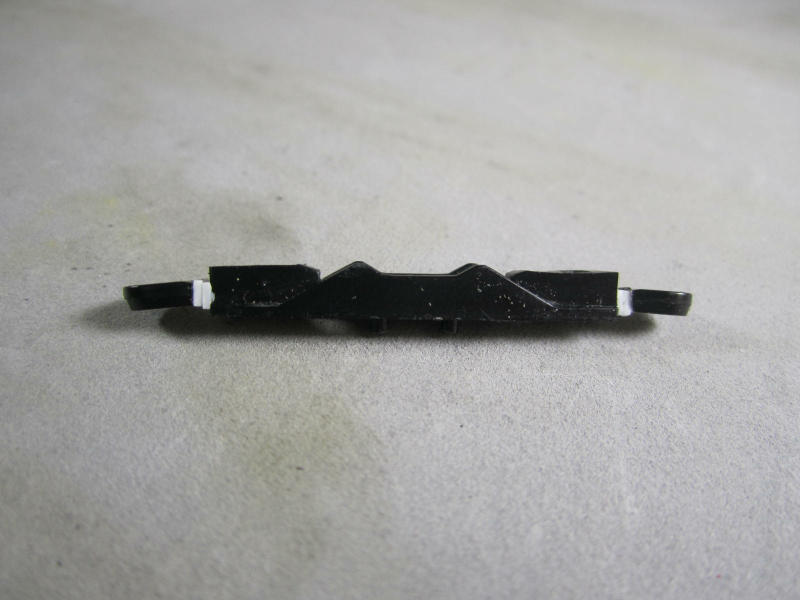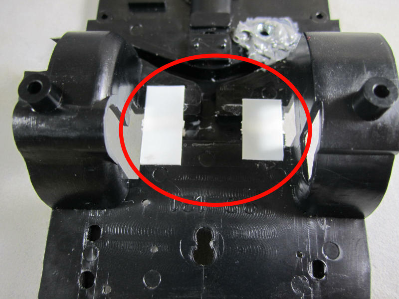 | こちらは車軸が上方向に抜けないための加工。 ただ単に上からプラ板を貼っただけ。 本当はハの字加工をどのようにやったか画像を撮って詳しく掲載するつもりでしたが 残念ながら画像を撮っていないのでまた他のキットの時に紹介します。 |