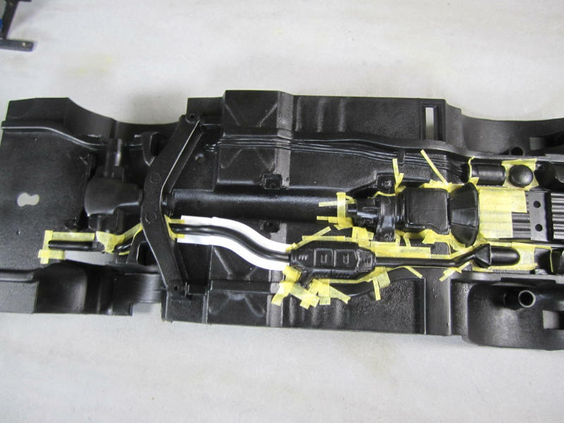 前回シャーシ全体をセミグロスブラックで塗装しましたが 今回はそれ以外の色を塗り分けていきます。 まず塗り分ける部分を縁取るようにマスキングをします この段階で仕様するマスキングテープは0.4ミリ〜3ミリのテープを使用しています |