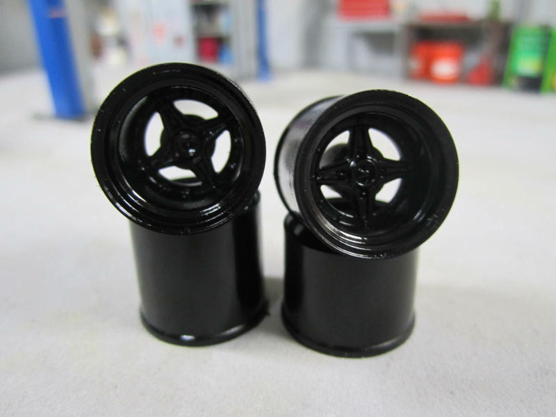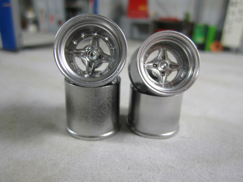 前回の工程で元々メッキ加工してあったパーツのメッキを剥がしましたが 今回はそれらの塗装です。 画像はホイール。 再度メッキ調塗料を塗るために下地としてフィニッシャーズのピュアブラックを吹きました。 |