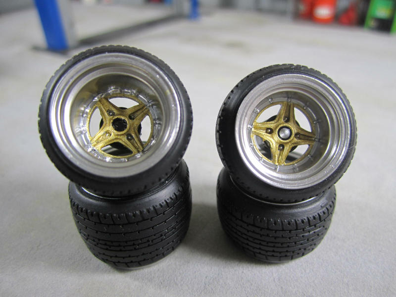 このホイールはスポーク部がゴールドなので画像のように塗装。 今回、スポーク部の塗装はエアブラシではなく筆塗りです。 4本のボルトはメッキシルバーで塗装、画像右のフロント側の中央部はフラットアルミを塗装後 墨入れをしています。リアは少し塗装の手直しが必要。。。 |