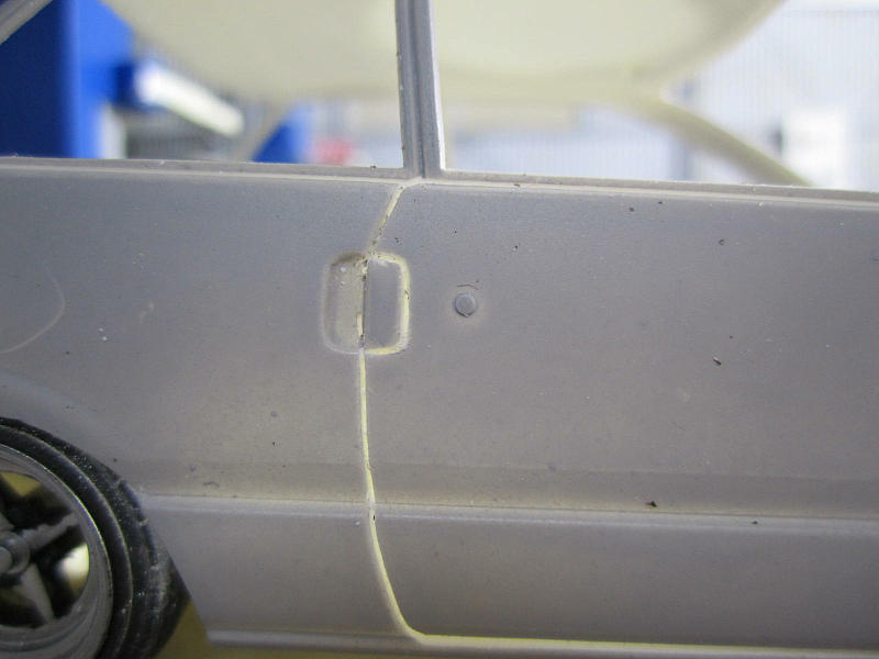 今回はボディの下処理。 まず磨き出しに邪魔なモールド等を削除したり、鍵穴に穴を開けたりします。 上の画像はフロントフェンダーに存在するウィンカー。 これはクリアーパーツを新規に作成します。 | こちらはドアの鍵穴。 一度穴を開けて別の素材に置き換えます。 |