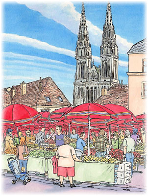 ザグレブ旧市街の青果市場は赤いパラソルが青空に映えて、思わず描きたくなってしまう風景です。