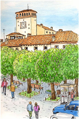 雨の上がったガリバルディ広場。向こうに見えているのは、レジーナ城。